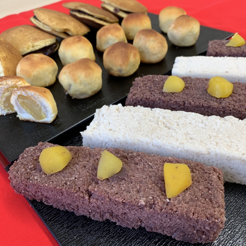 ■原材料 :小豆(北海道産)、白小豆、栗、上新粉、砂糖、卵、小麦粉、寒梅粉、みりん、さつまいも、バター、はちみつ、粉乳、ごま、ピーナッツ