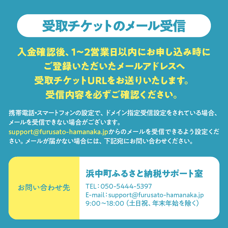 ※入金確認後、1~2営業日以内にお申し込み時にご登録いただいたメールアドレスへ受取チケットURLをお送りいたします。