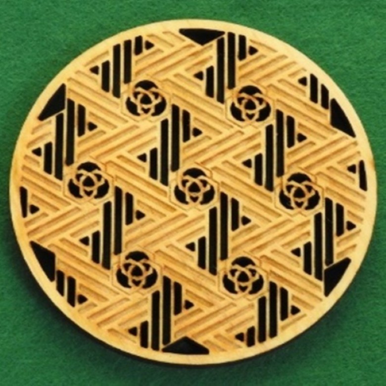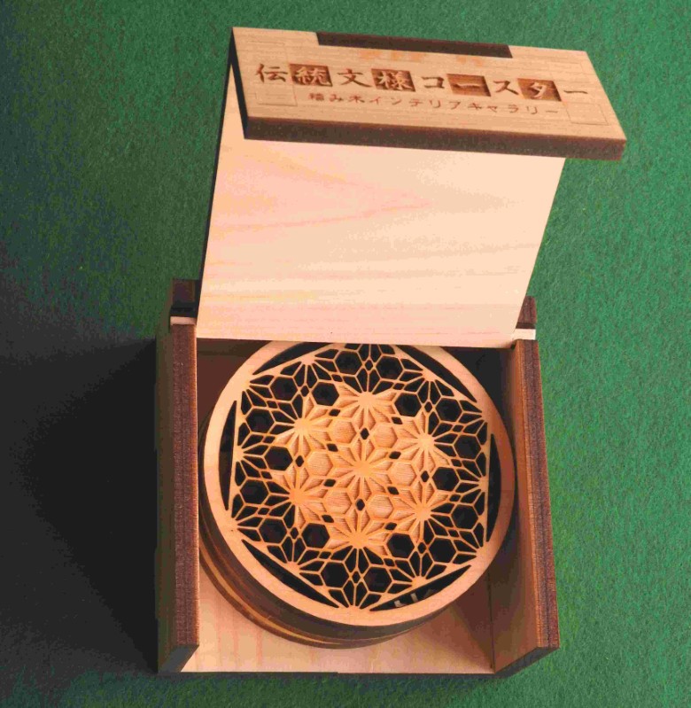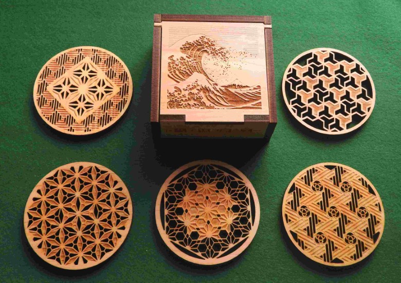 この北斎が遺したオリジナルの文様デザインを現代によみがえらせたヒノキ製のコースター5枚組です。
