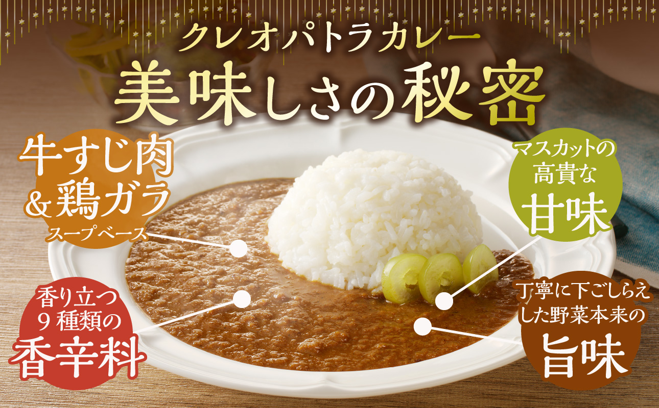 パッケージも女性を意識したオシャレなデザインとなっており、女性への贈り物や、自分へのご褒美として、いつもとひと味違うクレオパトラカレーを味わってみてはいかがでしょうか。