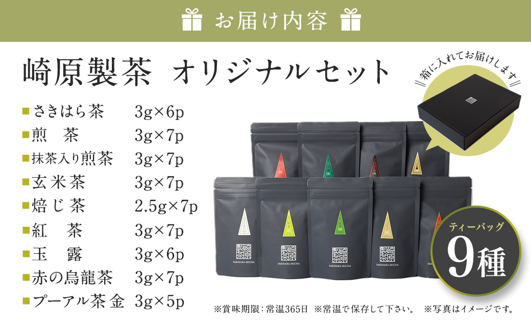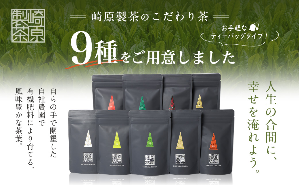 ティーパック9種セット(さきはら茶 3g×6p、煎茶 3g×7p、抹茶入り煎茶 3g×7p、玄米茶 3g×7p、焙じ茶 2.5g×7p、紅茶 3g×7p、玉露 3g×6p、赤の烏龍茶 3g×7p、プーアル茶金 3g×5p)