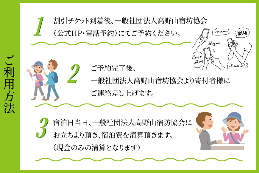 (2)割引チケット到着後、一般社団法人高野山宿坊協会(公式HP・電話予約)にてご予約ください。