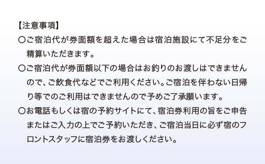 〇ご宿泊代が券面額以下の場合はお釣りのお渡しはできませんので、ご飲食代などでご利用ください。ご宿泊を伴わない日帰り等でのご利用はできませんので予めご了承願います。