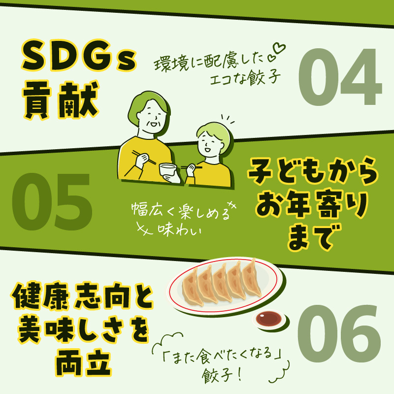 創業者の「家族団らんを応援する」という思いを引き継ぎ、餃子作りを続けることで、家族の元気をサポートし、SDGsへの貢献を掲げながら、業界の常識に挑戦しています。