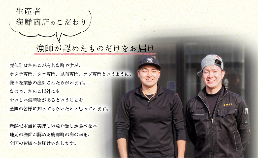 鹿部町はたらこが有名な町ですが、ホタテ専門、タコ専門、昆布専門、ツブ専門というように、様々な業態の漁師さんたちがいます。 なので、たらこ以外にもおいしい海産物があるということを全国の皆様に知ってもらいたいと思っています。