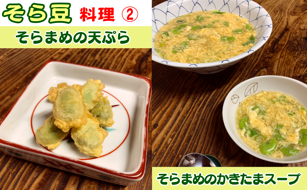 塩ゆではもちろんの事、薄皮付きの天ぷら、炊き込みご飯や、そら豆たっぷりのかきたまスープ、そら豆とじゃこのゴマ油炒め!