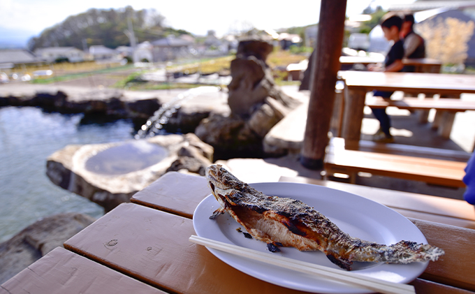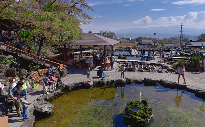 浅間の湧き水「松井の泉」の池で新鮮なニジマスを釣っていただき、備長炭にて炭火焼にしてご提供いたします!