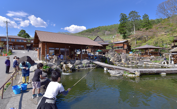 県下最大級のつり堀は、ニジマス池4面、鯉池1面、一度におよそ100人で釣りが楽しめます。