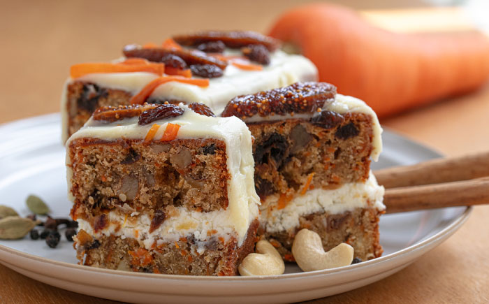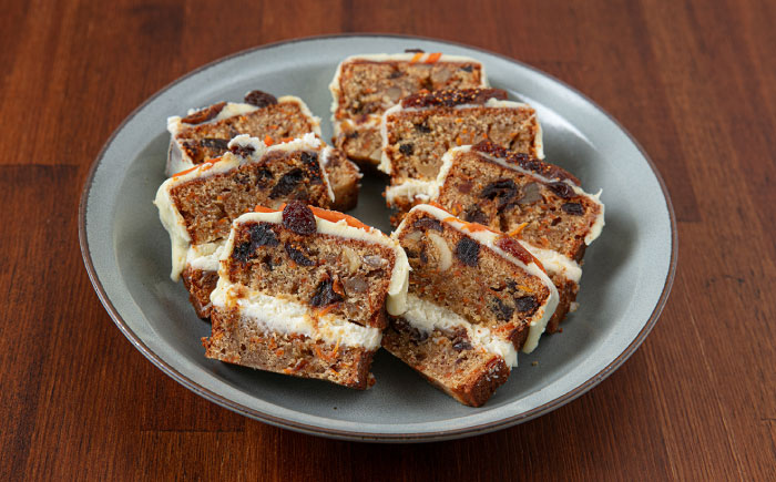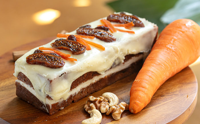 たっぷりと使用したスパイス、ナッツ、ドライフルーツ、仕上げのチーズフロスティングが調和した、他にはない贅沢な味わいのキャロットケーキです。