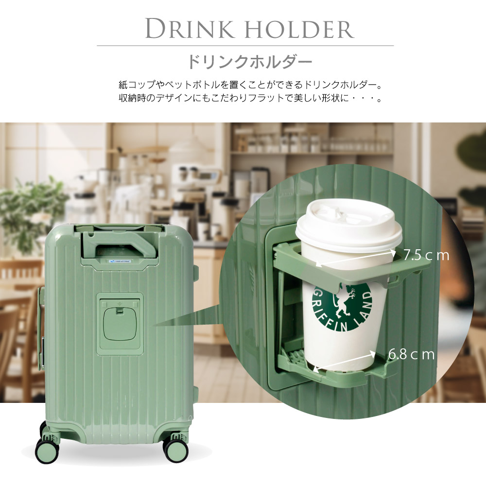 スーツケース背面には飲み物を入れることができるドリンクホルダー付き。