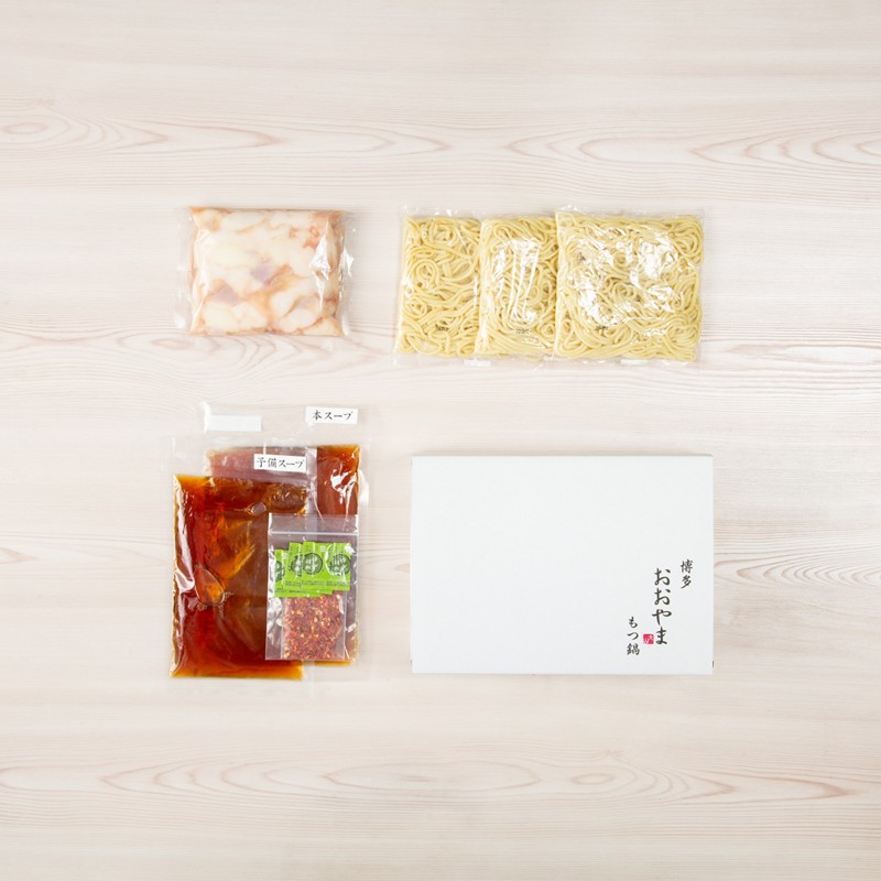 【おおやま醤油2人前】スープ(醤油味)150g +予備100g 、牛もつ240g 、ちゃんぽん麺300g 、唐辛子3g 、柚子胡椒4g
