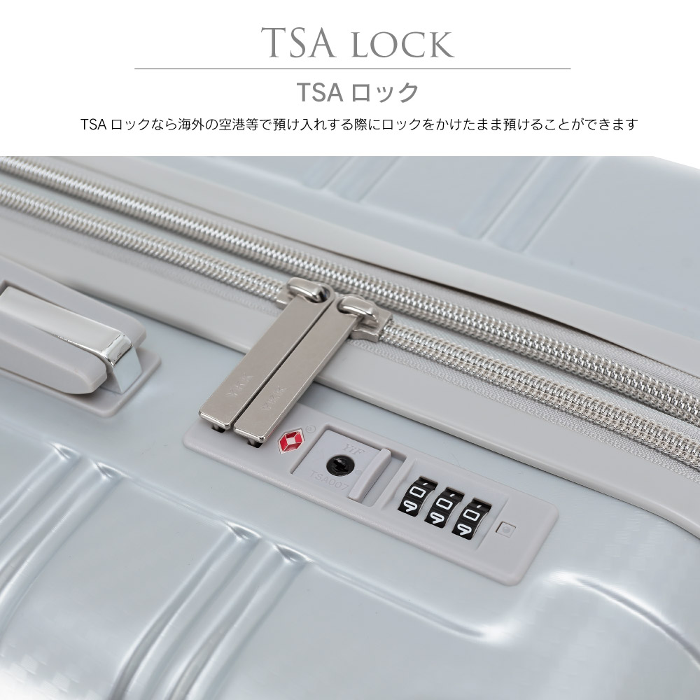 ロック部分はTSAロックを搭載。荷崩れを防ぐ仕切り板は両側に、クロスベルトは片方についています。キャリーバーは多段調整可能。