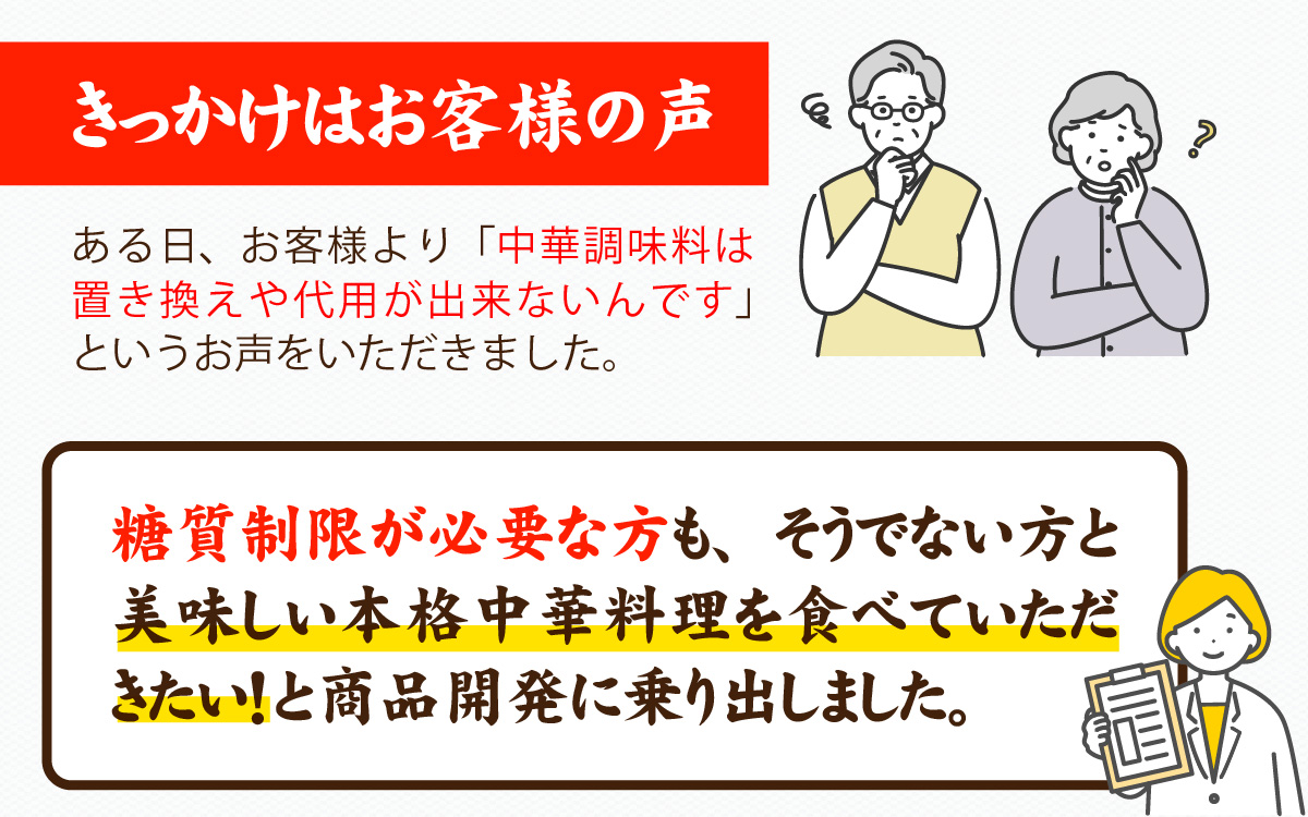 調味料の糖質を気にせず本格的な中華料理を楽しみたいというお声をきっかけに、当社が掲げる「家族みんなが同じおいしさを共有できる」という想いのもと、糖質制限が必要な方も、そうでない方も一緒に美味しい本格中華料理を味わっていただきたい!