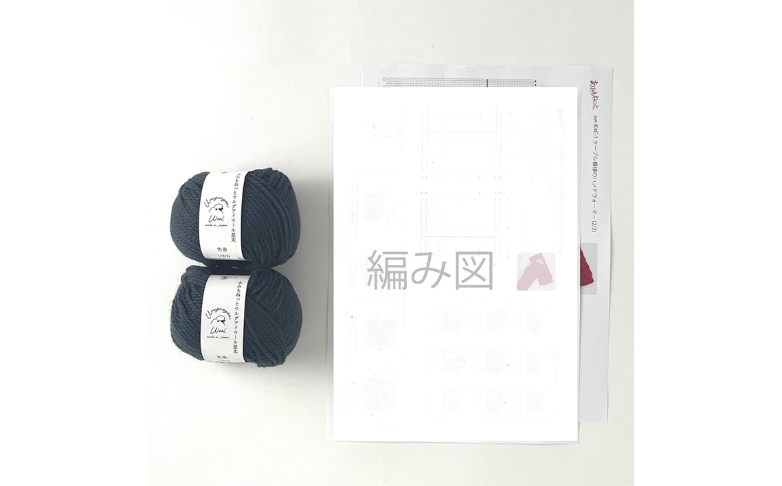 本キットは、毛糸2玉で編み上げられる分量となっており、左右1組のハンドウォーマーを制作できます。