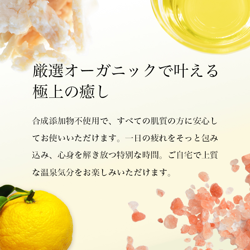 合成添加物を一切使用せず、やさしい使い心地を目指したこのセットは、ご自宅で上質な温泉気分を味わいたい方に最適です。