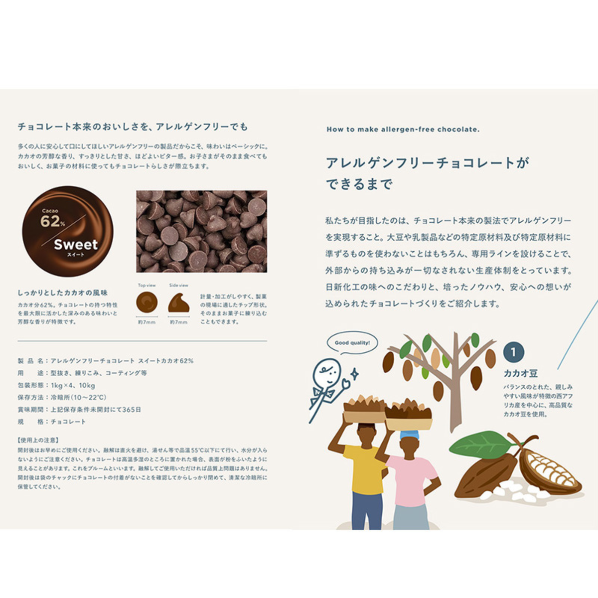 カカオ分62%。ビター感と甘さのバランスがとれ、口溶け良くすっきりとした後味でお子さまがそのまま食べても美味しく、お菓子の材料にも最適です。