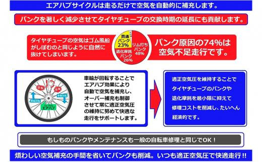 エアハブサイクルは走るだけで空気を自動的に補充。常に適正空気圧を保持し、パンクを減少しつつタイヤチューブの保護にもなり交換時期の延長にも繋がります。メンテナンスも一般的な自転車と同作業で可能。