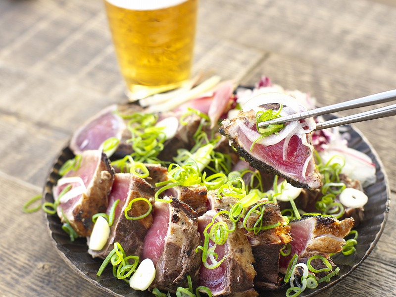 玉ねぎやにんにく・ミョウガなどの薬味をたっぷりまぶしてポン酢で食べる、かつおのたたき丼で食べる等、楽しみ方はいろいろ!