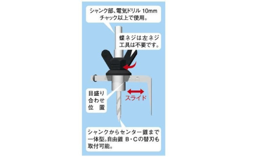 工具不要、蝶ねじで簡単に穴径を調節可能。