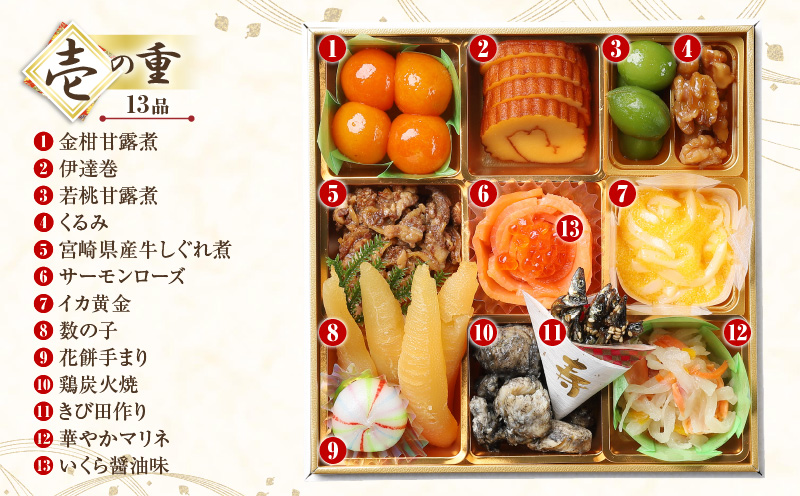 金柑甘露煮 4個、伊達巻 4個、若桃甘露煮 4個、くるみ 20g、宮崎県産牛しぐれ煮 40g、サーモンローズ 1個、イカ黄金 40g、数の子 4本、花餅手まり 1個、鶏炭火焼 40g、きび田作り 15g、華やかマリネ 40g、いくら醤油味 5g