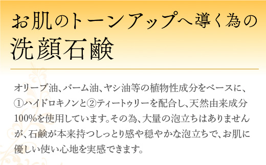 エタノール、水、オリーブ油、スクロース、水添パーム油、ヤシ油、グリセリン、水酸化Na、パーム油、ヤシ油、塩化Na、ティートゥリー精油、ハイドロキノン、トレハローズ