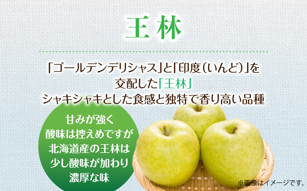 「王林」は、「ゴールデンデリシャス」と「印度(いんど)」を交配した黄緑色のりんごで、シャキシャキとした歯ごたえと独特の香りを持つ香り高い品種です。甘みが強く、酸味は控えめな品種ですが、北海道産の王林は、少し酸味が加わり濃厚な味になります。