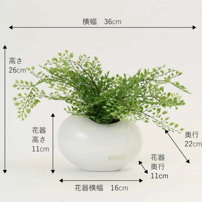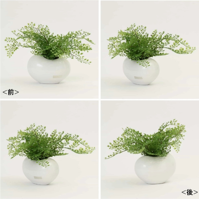 小さな葉でフワッとしたエアリー感と、花器の丸いフォルムがマッチした可愛らしいグリーンアレンジ。