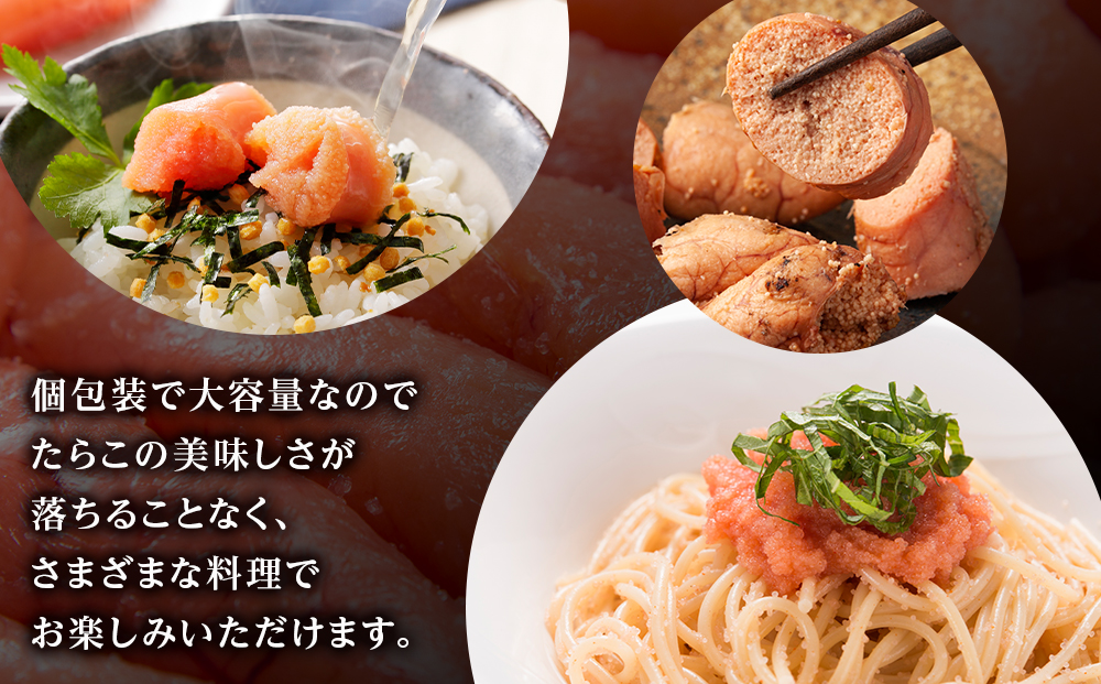 倶多楽湖の良質で知られる伏流水とこだわりの塩で仕込み、秘伝の調味液にじっくり漬込みました。100gずつ密閉パックされていますので、使いたい時、使いたい分だけ解凍出来る便利なたらこです。
