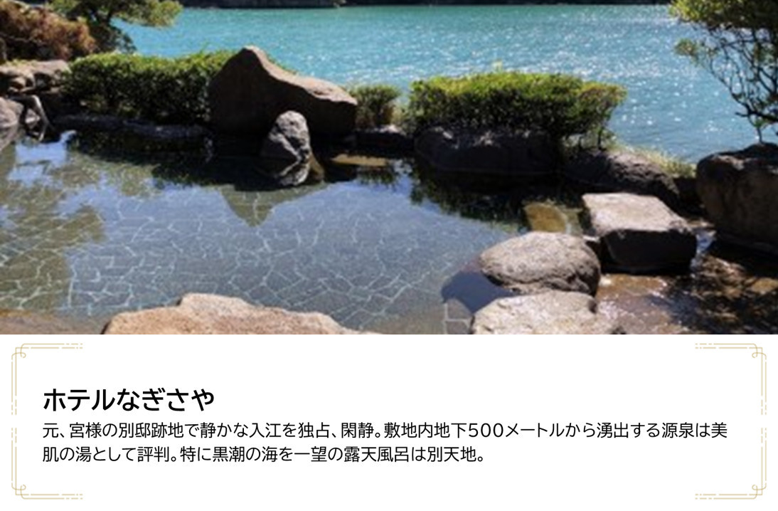 元、宮様の別邸跡地で静かな入江を独占、閑静。敷地内地下500メートルから湧出する源泉は美肌の湯として評判。特に黒潮の海を一望の露天風呂は別天地。