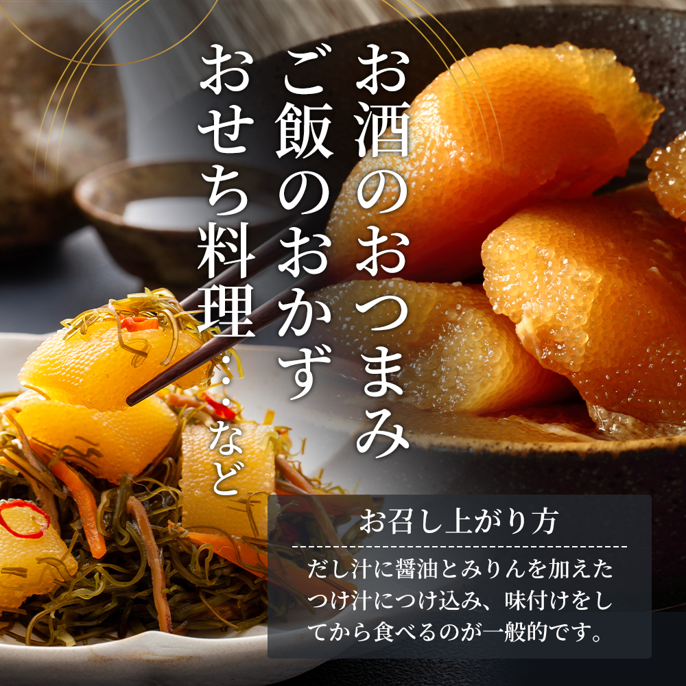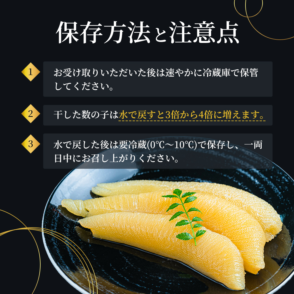 干した数の子は、水で戻すと3倍から4倍に増えます。お召し上がりの方法としては、だし汁にしょうゆとみりんを加えた、つけ汁につけ込み、味付けをしてから食べるのが一般的な食べ方です。
