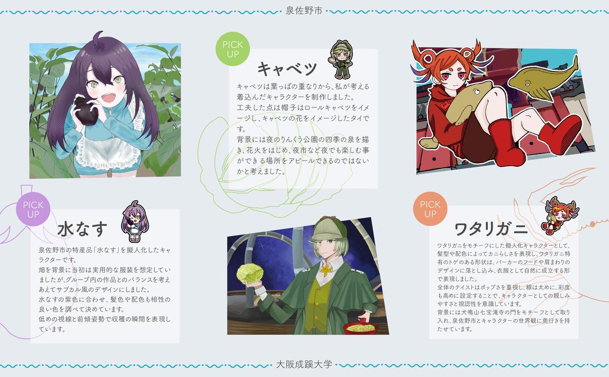 泉佐野市の特産品をモチーフに擬人化したキャラクターを描き下ろし、地域性とキャラクターデザインを掛け合わせた一枚に仕上げました。