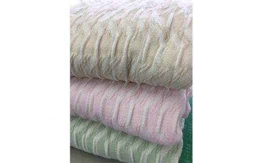 天然コットンを使った、軽くて、ボリュームがあり、暖かい毛布を目指し、表と裏の毛羽部分は綿100%、中の地組織を収縮させ3層構造により、お肌に触れる部分はコットン100%、それも新開発の吸湿発熱コットンを使うことで実現いたしました。