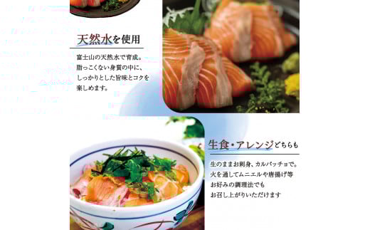 循環式陸上養殖場「富士・桂川ファクトリー」で、水質が良い富士山の伏流水を使用し養殖しています。最先端のICT技術を活用し、資源の節約や品質確保を実現しました。また、綺麗な地下水で屋内養殖することで、ワクチンや投薬等をすることなく寄生虫や病原菌の心配のない、安心安全で美味しいサーモンを提供することができるようになりました。