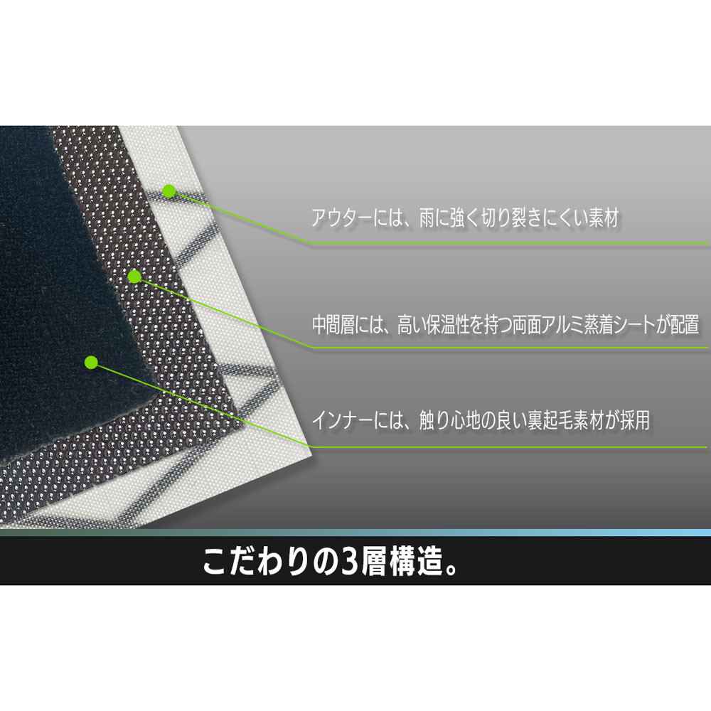 外側には切り裂き強度が高く、雨にも強い撥水素材。中間層には、保温性の高い両面アルミ蒸着シート。インナーには、手触りの良い裏起毛素材。こだわりの3層構造です。