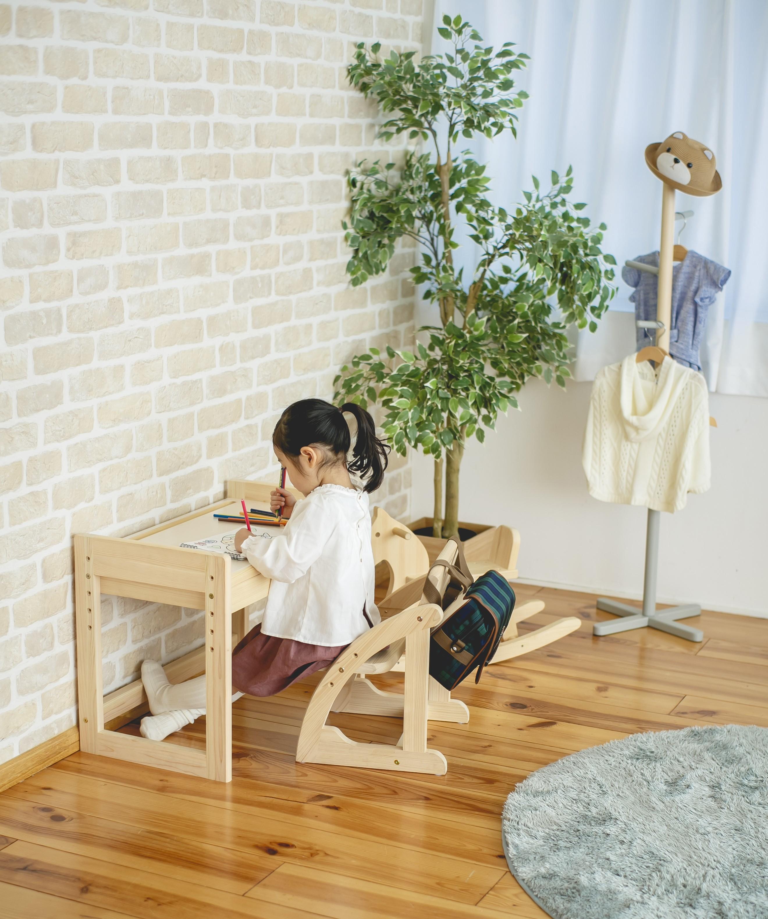 お子さまの成長に合わせて高さを調節できる総ひのきのキッズデスクです。