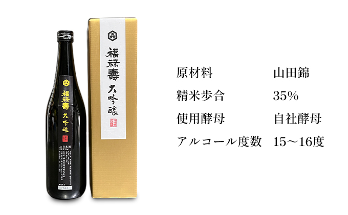 酒造好適米、酒米の王様山田錦を35%まで削ったスムーズでなめらか、そして清涼感のある爽やかな辛口の大吟醸です。仕込み水は蔵内の湧水を使用した「一白水成」でおなじみの地元「福禄寿酒造株式会社」で醸された逸品です。丹精こめた蔵人のこだわりと、可能な限りの手間と時間をかけた大吟醸…。一度は口にしたい贅沢な味わいに仕上がってます。