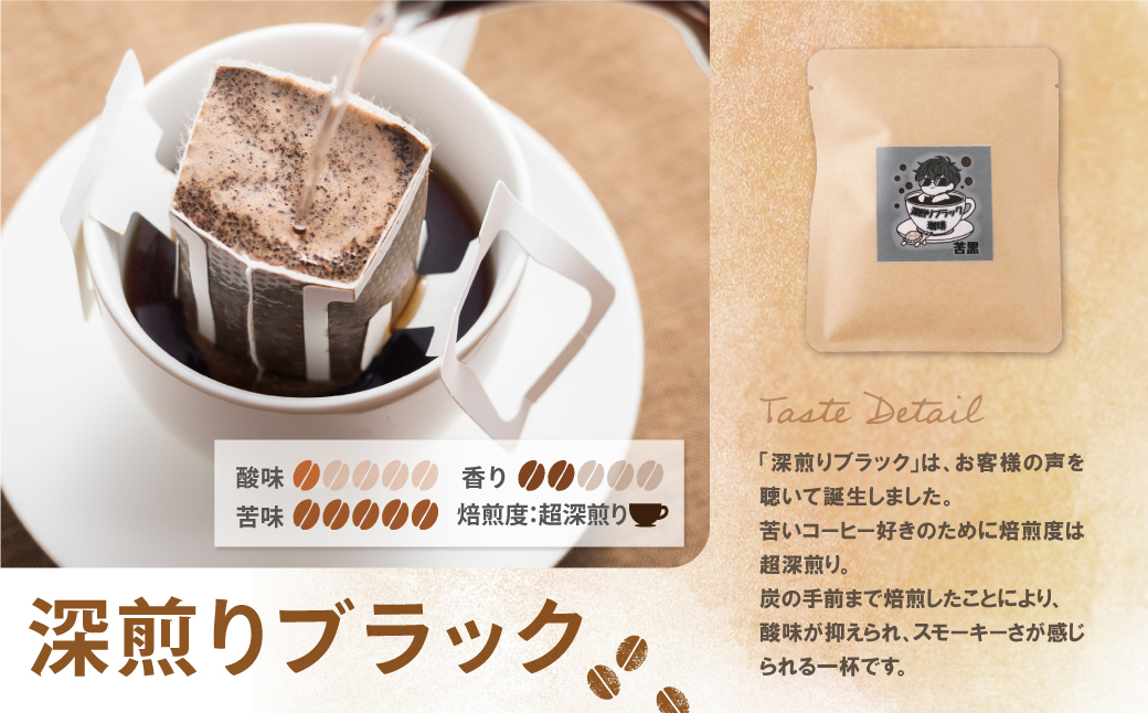 炭の手前まで焙煎したことにより、酸味が抑えられ、スモーキーさが感じられる一杯です。