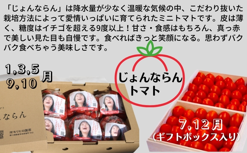 【1・3・5・7・9・10・12月】「じょんならん」は降水量が少なく温暖な気候の中、こだわり抜いた栽培方法によって愛情いっぱいに育てられたミニトマトです。薄皮でイチゴを超える糖度9度以上を実現しました。是非ご賞味ください。