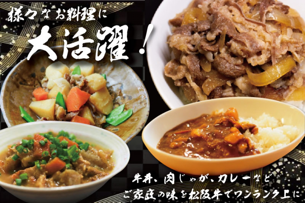 小間切り落としは使い勝手もよく、松阪牛特有の旨みと甘みをさまざまなお料理でお楽しみいただけます。