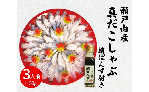 - 真ダコしゃぶ3人前セット(150g)、たこぽんず120ml ※当該返礼品は、市内で製造しており、全体の付加価値の半分を一定以上上回る割合を占めています。