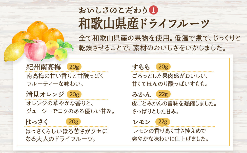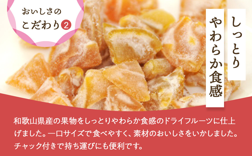 和歌山県産の果物をしっとりやわらか食感のドライフルーツに仕上げました。