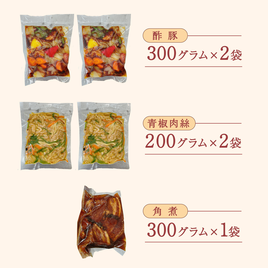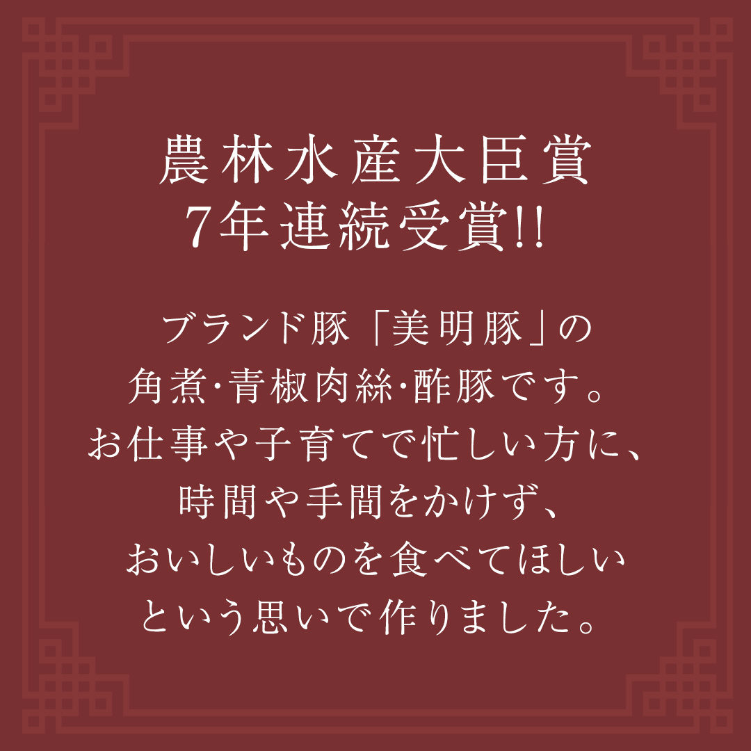 茨城県行方市産のブランド豚「美明豚」の角煮&青椒肉絲&酢豚セットです。