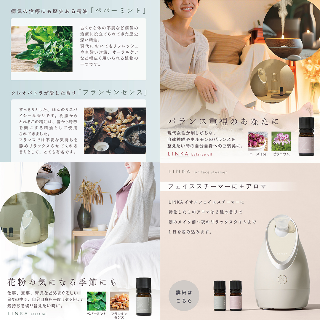 LINKA バランスオイル&リセットオイルは、癒しと美容を同時に叶えるアロマオイル。もちろん、イオン フェイス スチーマーと併用が可能です。2種類の香りで、どんなときも心地よく気持ちを整えます。