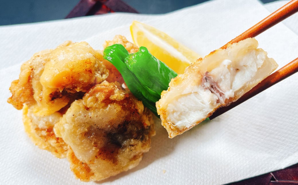 まふぐ(北海道産)、下味調味液[食塩、昆布エキス]、唐揚げ粉[コーンスターチ(とうもろこし(遺伝子組換え不分別))、食塩、砂糖、デキストリン、植物油]/加工デンプン
