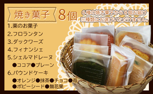 ※焼き菓子は、栗、フロランタン、ダックワーズ、フィナンシェ、シェルマドレーヌ(ココア、プレーン)、パウンドケーキ(オレンジ、抹茶、チョコ、苺、ポピーシード、無花果)の中のいずれかになります