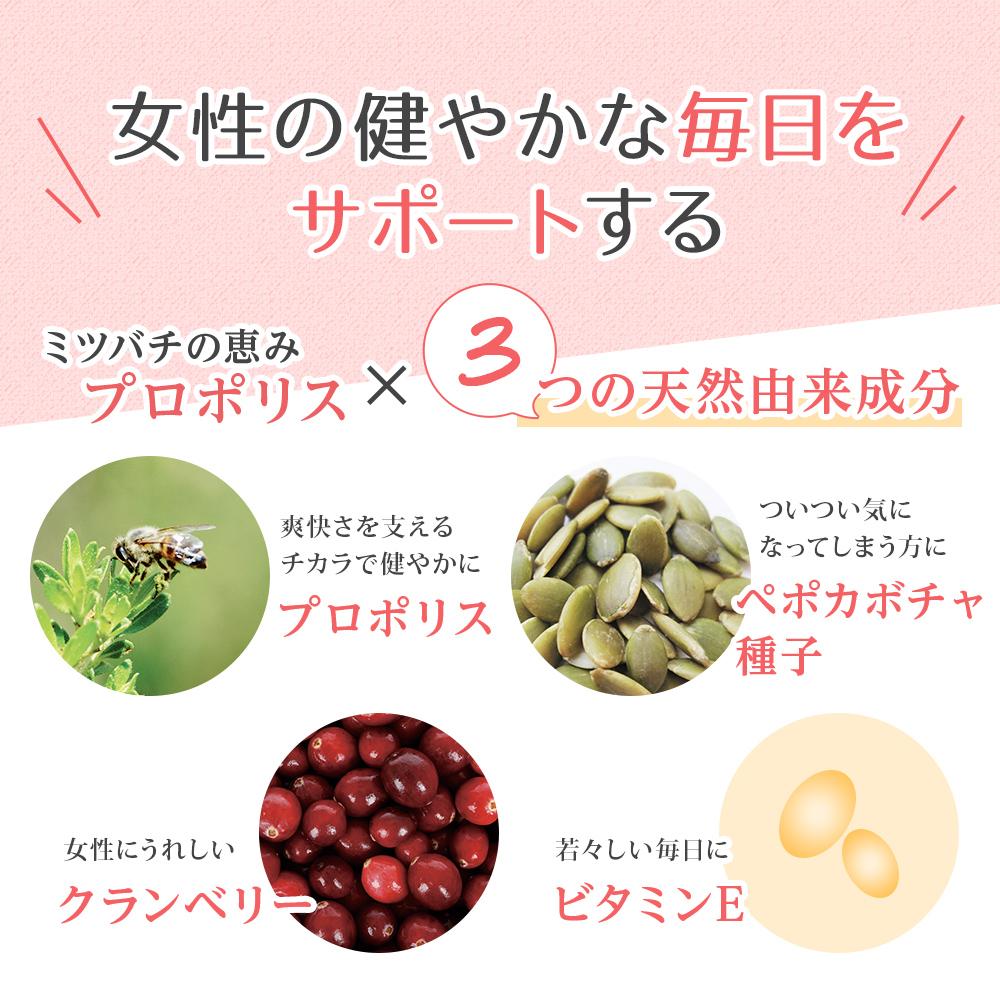 天然の抗菌成分プロポリスエキスに加え、繰り返しがちな膀胱のお悩みに役立つクランベリーエキスや夜間のトイレのお悩みに働きかけるペポカボチャ種子エキス、強い抗酸化力をもつビタミンEを配合しています。