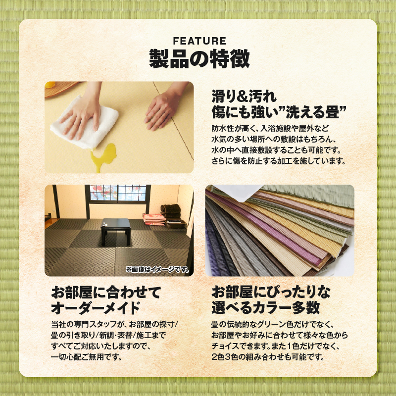 洗える畳『洗畳』の特徴は、汚れに強く塩素系漂白剤や中性洗剤でお手入れをする事が可能です。