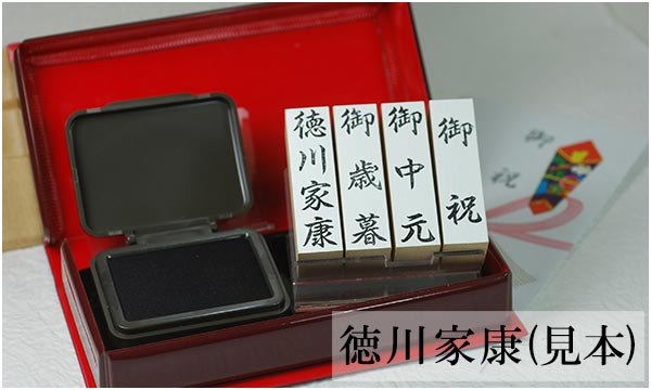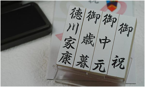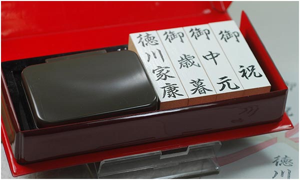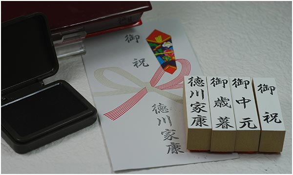 セット内容:ゴム印4個「氏名」「御歳暮」「御中元」「御 祝」(タテ約6cm・ヨコ約1.6cm・高さ約2.3cm)