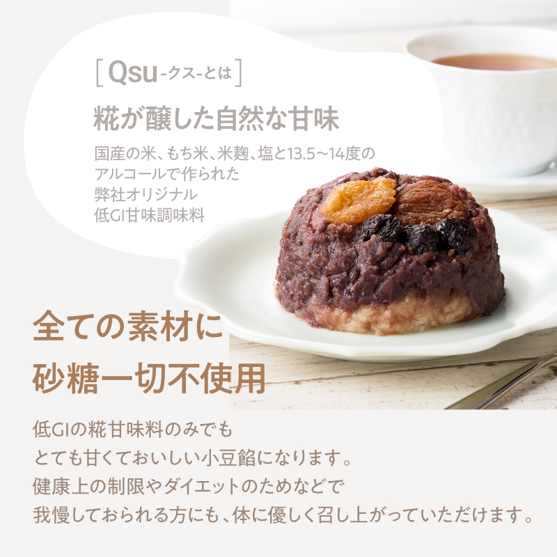 砂糖を使用しない小豆餡は、米糀で醸した甘味調味料「Qsu」(弊社オリジナル低GI品)で煮あげています。