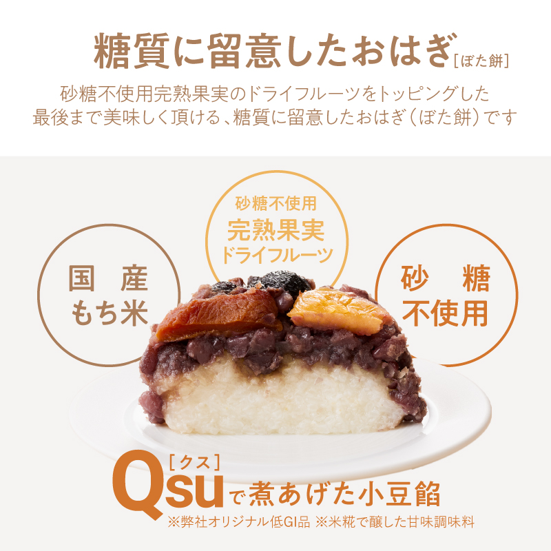 砂糖不使用・完熟果実のドライフルーツをトッピングし、最後まで美味しく召し上がっていただける、糖質に留意したおはぎ(ぼた餅)です。